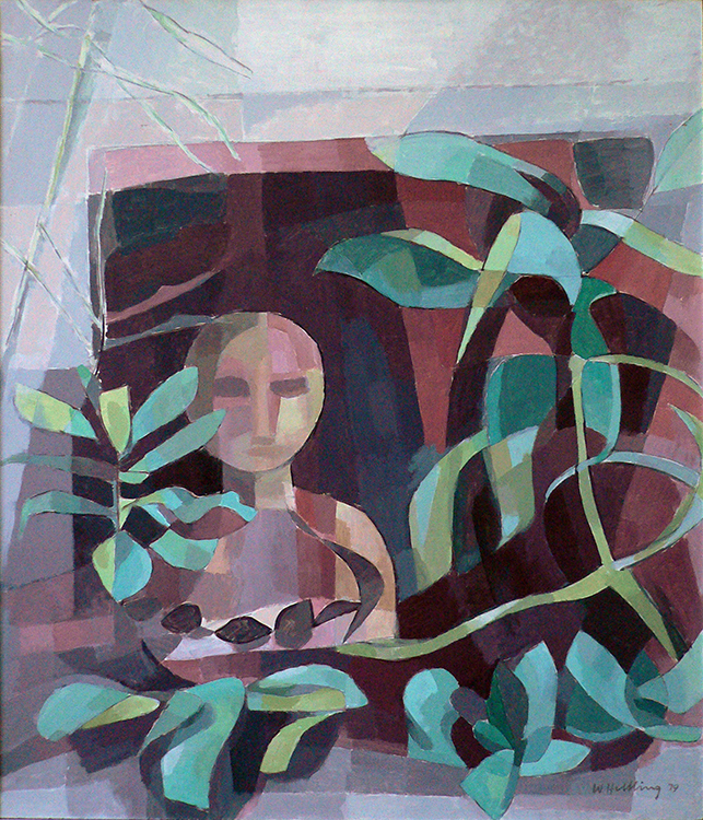 Schon beim, ersten Blick fallen die erwähnten Übereinstimmungen und Konstanten im Werk Helblings auf: an den Blumenbildern, den Petuniendarstellungen der jüngsten Zeit zum Beispiel, bemerkt man sofort die leuchtenden Farben; nicht mehr so sehr das Motiv ist wichtig, sondern die Zusamenstellung der Farben, der Rythmus der Farbflächen und die Ordnung innerhalb der einzelnen Blüte. Selbst im kleinen Format ist Helblings Neigung zur Wandmalerei erkennbar, zur grossflächigen Arbeit die ihm besonders von Danioth nahegebracht wurde und die vor allem in den Sgraffiti und in der Glasmalerei zum Zug kommt. Auch hier, in den 1983 fertig gestellten Kirchenfenster von Huttwil zum Beispiel, finden sich diese leuchtenden, lebendigen Farbflächen: rot, gruen, weiss, Wolkenlandschaften und fruchtbare Felder. Und wie in den Glasfenstern die farbigen Flächen hart aneinandergesetzt sind und wie da aus wenigen Farben viele Abstufungen herausgeholt werden – helles Grün über Sattgrün bis zu Blaugrün und Blau, Schwefelgelb, Goldgelb und Braungelb- so geschieht das auch in den Acrylbildern. Auch da fällt die unvermittelte Aneinandersetzung farbiger Flächen auf; sie wirken trotz Farbmischung intensiv wie Glasfenster. Ob in den Fenstern oder in den Bildern: hier wie dort gibt es gross angelegte Farbballungen, deren Komposition den Bildraum ausmacht. Liest man die Bilder oder die Fenster, so beginnt eine Farbe nach der andern zu leuchten, wahre Farbakkorde entstehen; es entsteht Licht. Und weil häufig harmonische Farbabstimmungen die Bilder zum Leuchten bringen, möchte man diese Kunstwerke oft auch schön nennen.