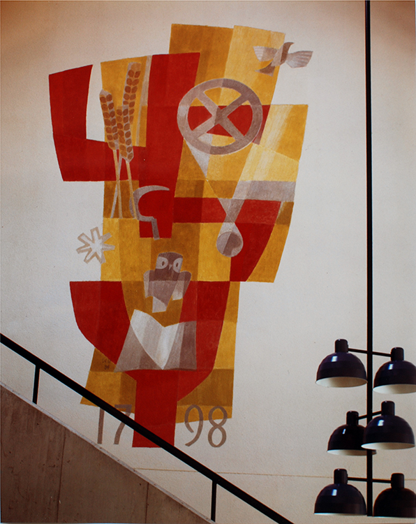 Sarmensdorf Mehrzweckgebäude 1984, Wandbilder Foyer und Treppenhaus sowie farbliche Gestaltung Innen und Aussen